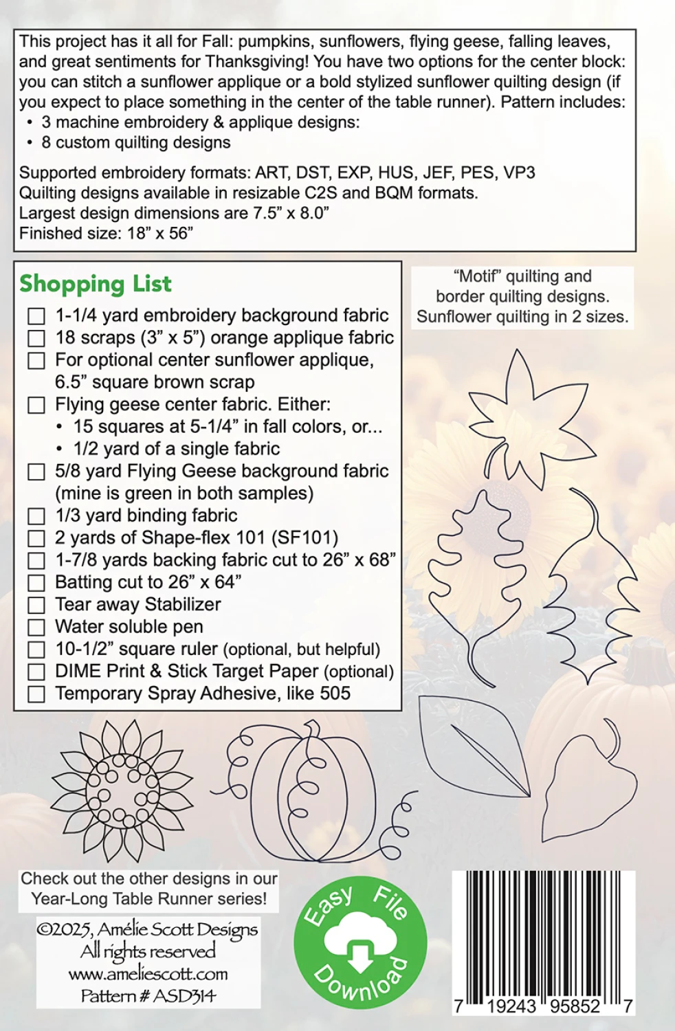 This project has it all for Fall: pumpkins, sunflowers, flying geese, falling leaves, and great sentiments for Thanksgiving! You have two options for the center block: you can stitch a sunflower applique or a bold stylized sunflower quilting design (if you expect to place something in the center of the table runner).
