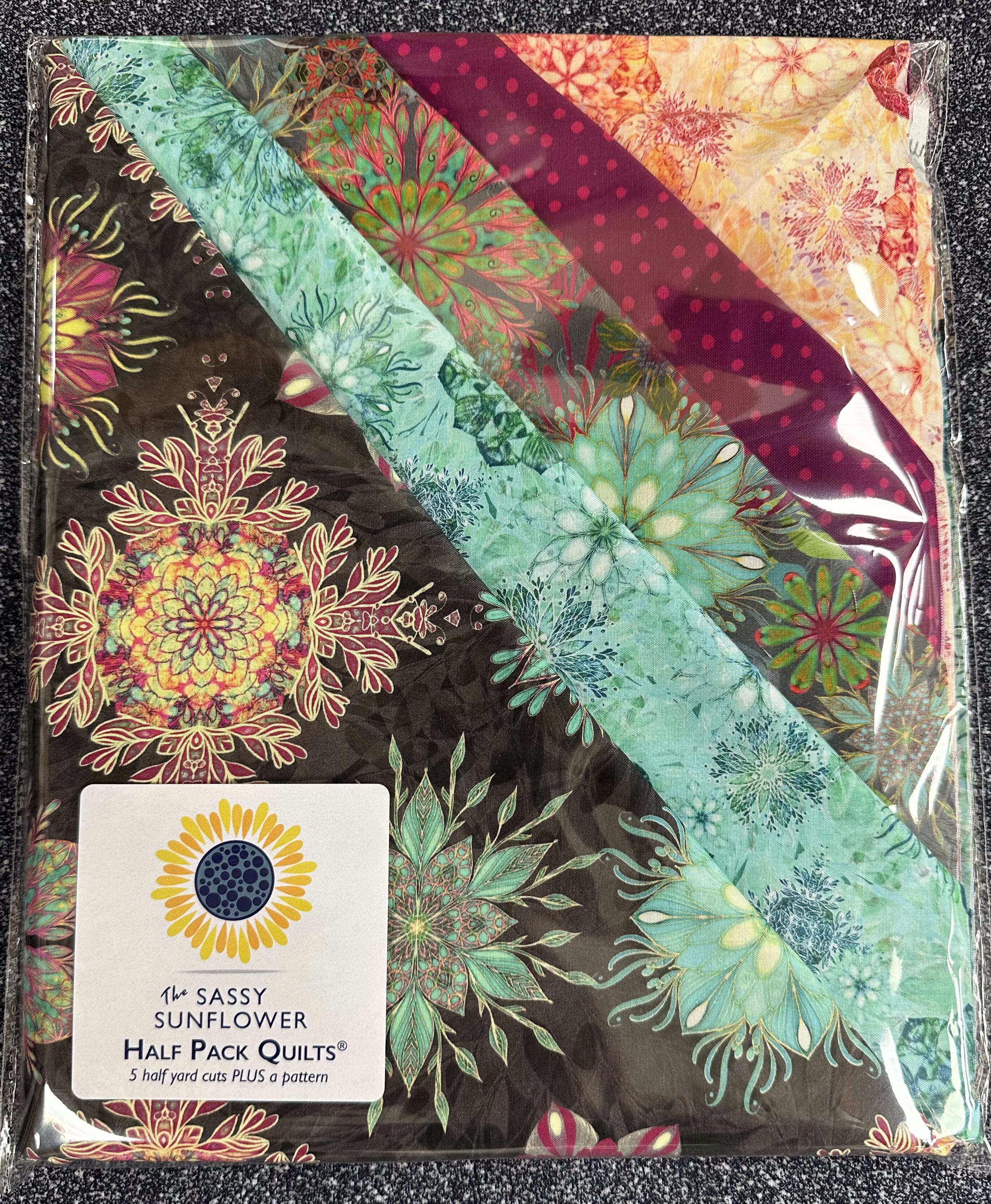 Each pack contains Five Half yard cuts of coordinating fabrics and is enough to make an entire quilt top, or the Tippy Tote! Your choice of one original Sassy Sunflower pattern is included with each half-pack purchase. Please indicate which pattern you would like in the “Notes” section during checkout. If fabrics shown are directional, please keep this in mind when choosing your pattern. NOTE: Backing and binding are not included in the kit.