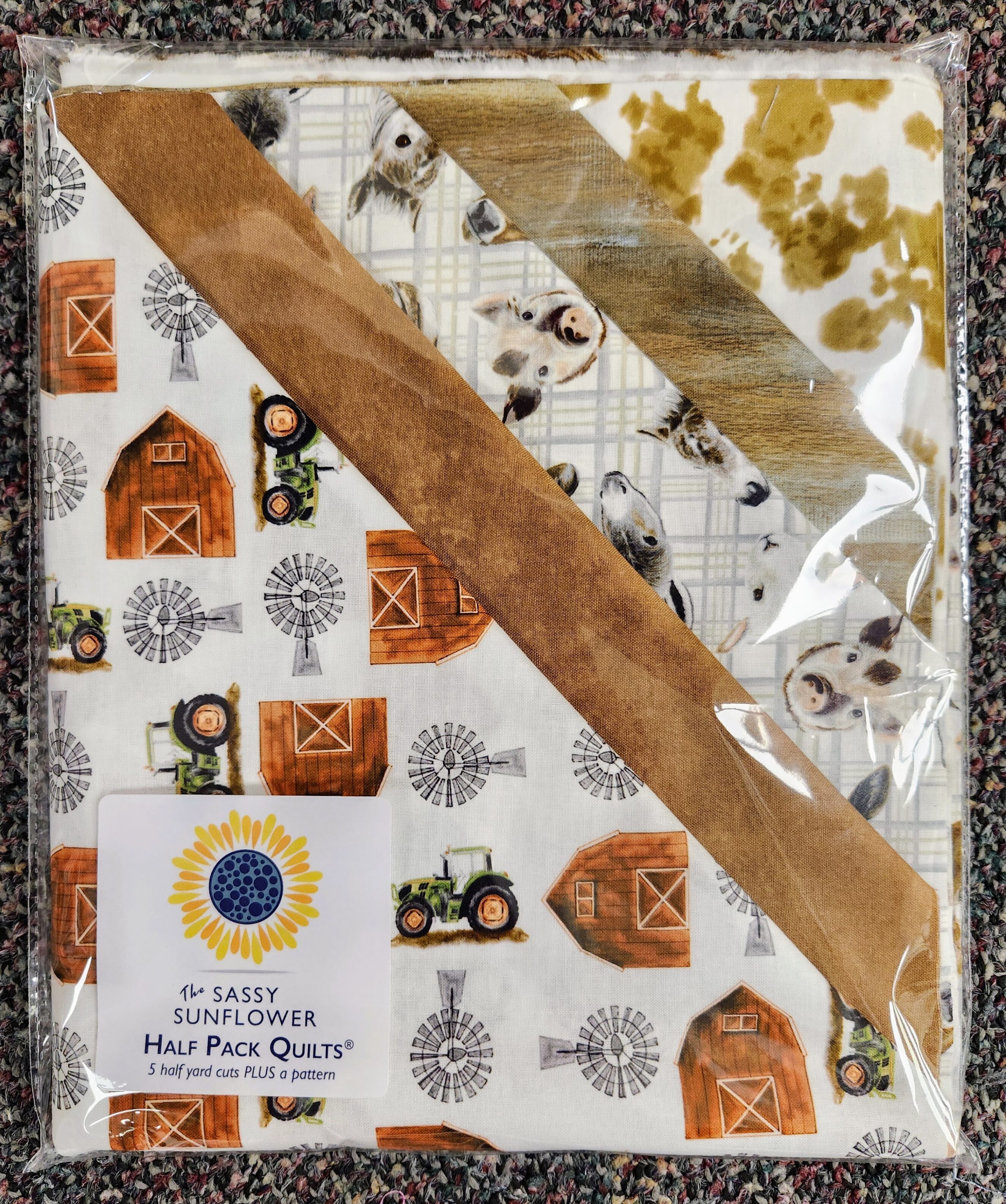 Each pack contains Five Half yard cuts of coordinating fabrics and is enough to make an entire quilt top, or the Tippy Tote! Your choice of one original Sassy Sunflower pattern is included with each half-pack purchase. Please indicate which pattern you would like in the “Notes” section during checkout. If fabrics shown are directional, please keep this in mind when choosing your pattern. NOTE: Backing and binding are not included in the kit.