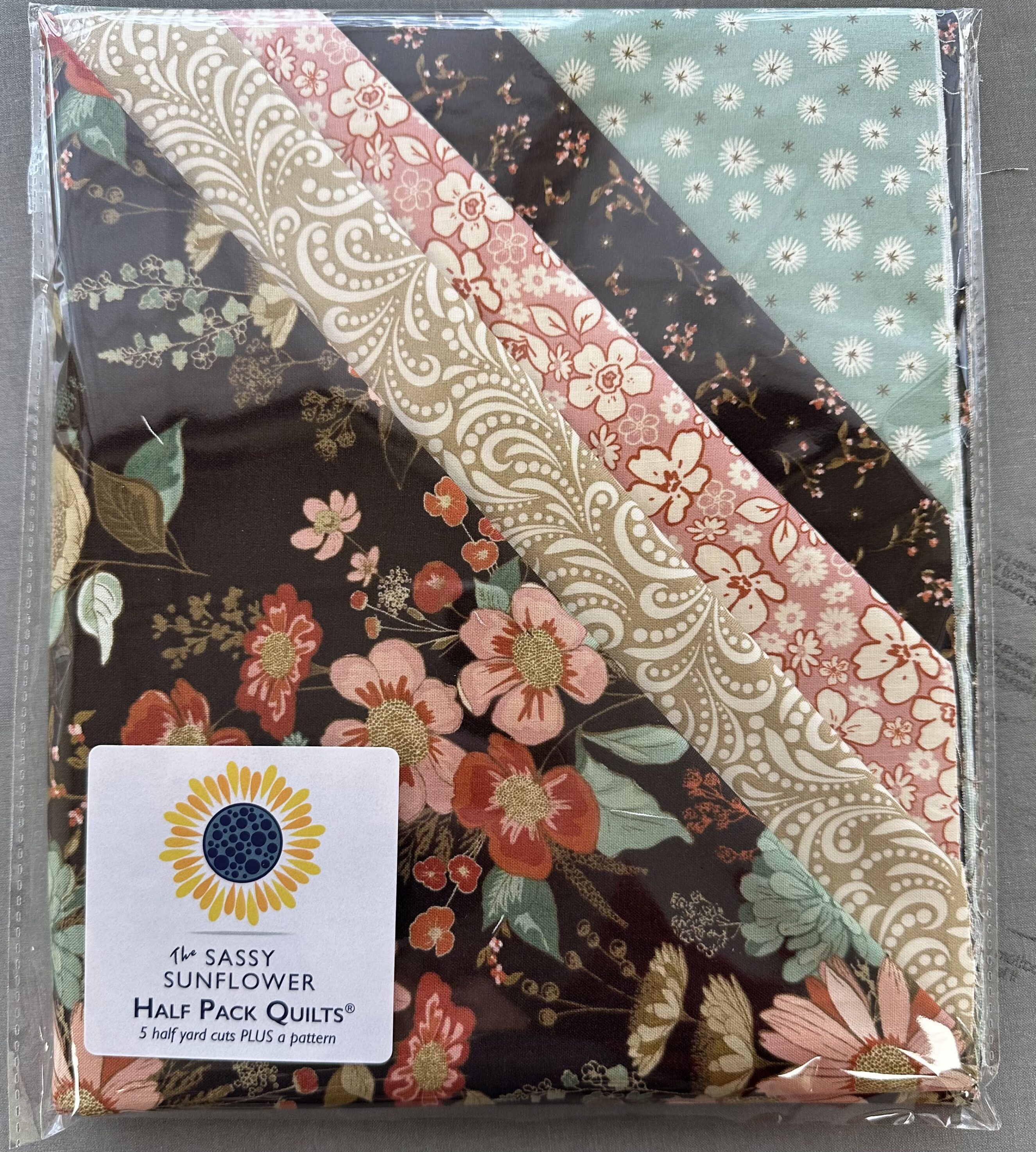 Each pack contains Five Half yard cuts of coordinating fabrics and is enough to make an entire quilt top, or the Tippy Tote! Your choice of one original Sassy Sunflower pattern is included with each half-pack purchase. Please indicate which pattern you would like in the “Notes” section during checkout. If fabrics shown are directional, please keep this in mind when choosing your pattern. NOTE: Backing and binding are not included in the kit.