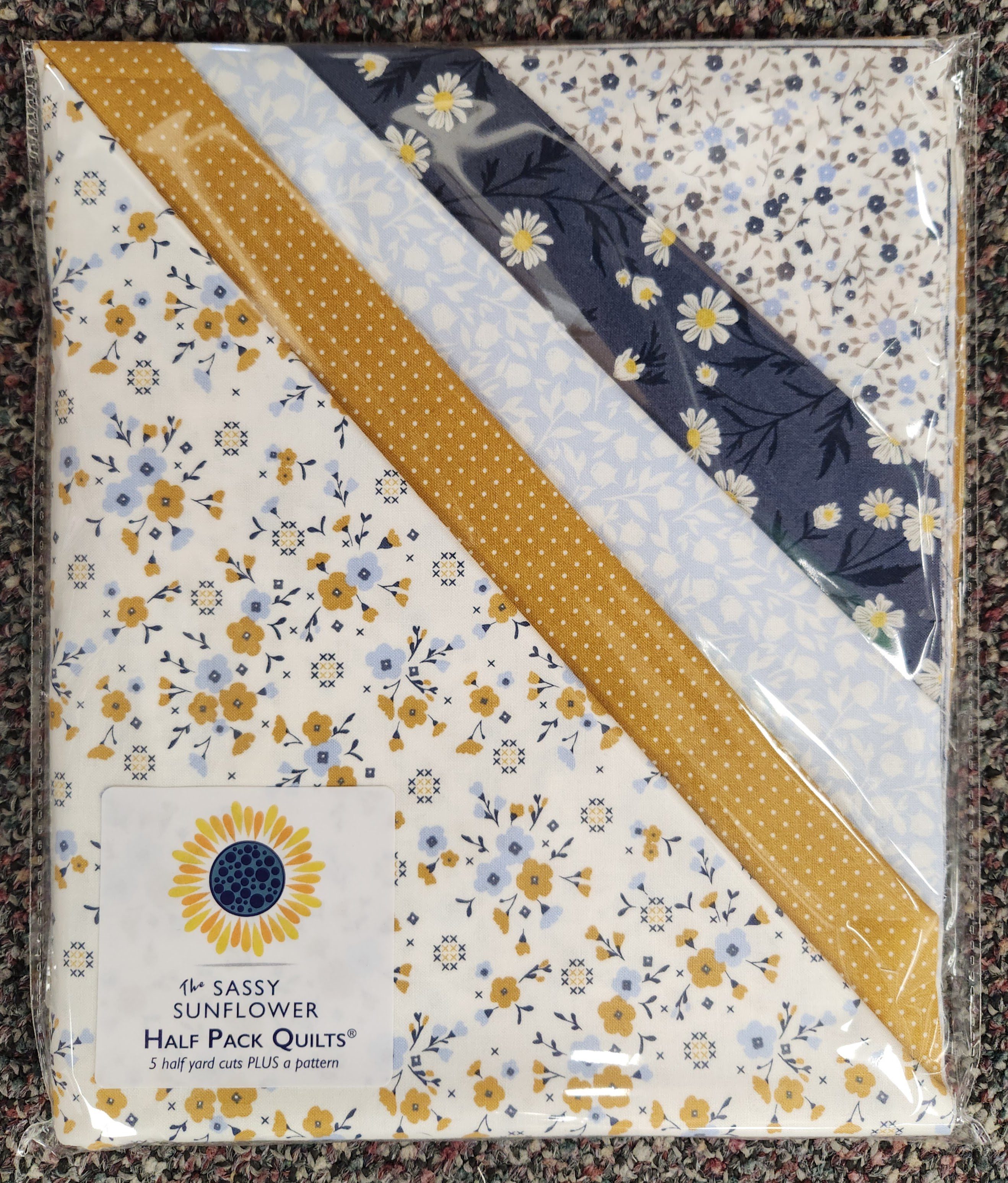 Each pack contains Five Half yard cuts of coordinating fabrics and is enough to make an entire quilt top, or the Tippy Tote! Your choice of one original Sassy Sunflower pattern is included with each half-pack purchase. Please indicate which pattern you would like in the “Notes” section during checkout. If fabrics shown are directional, please keep this in mind when choosing your pattern. NOTE: Backing and binding are not included in the kit.